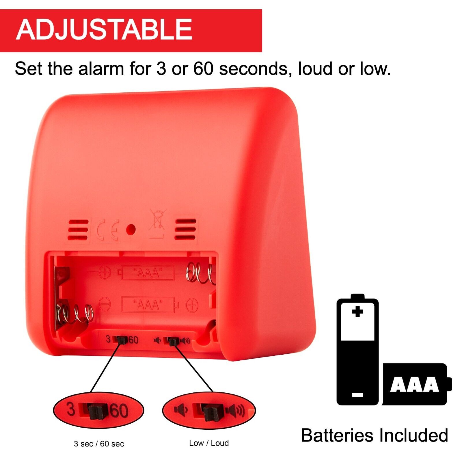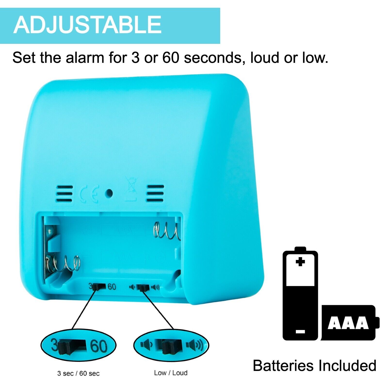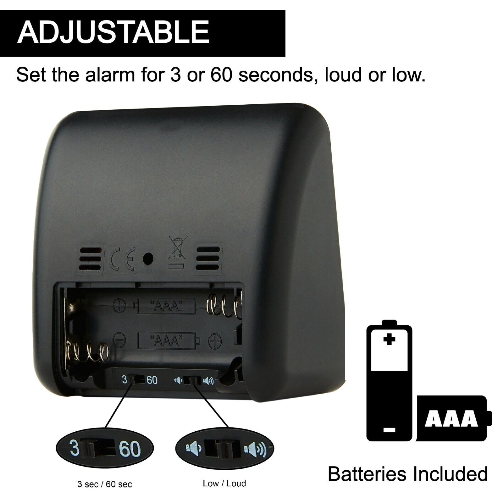 Alarm settings: 3 or 60 seconds long with two volume settings.